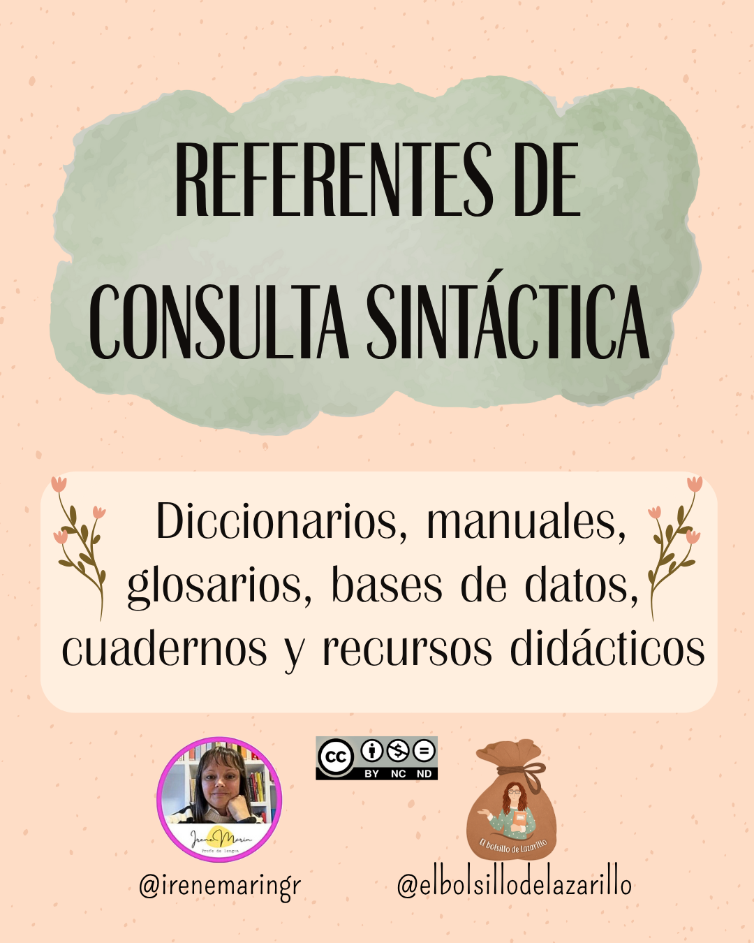 Mi querida Natalia, de @elbolsillodelazarillo, y yo os traemos un dosier de referentes de consulta sintáctica que incluye manuales, glosarios, obras académicas, cuadernos de ejercicios… y muchos recursos más que son muy útiles para el aula. Este es un trabajo realizado desde nuestras cuentas: @elbolsillodelazarillo e @irenemaringr, dos frikis sintácticas que, cuando unen sus mentes, salen estas locurillas.
